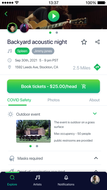 An artist's story that shows the artist’s sound, venue, and overall vibe of the show. This would be the most expressive way to motivate both personas into looking at the event’s detail